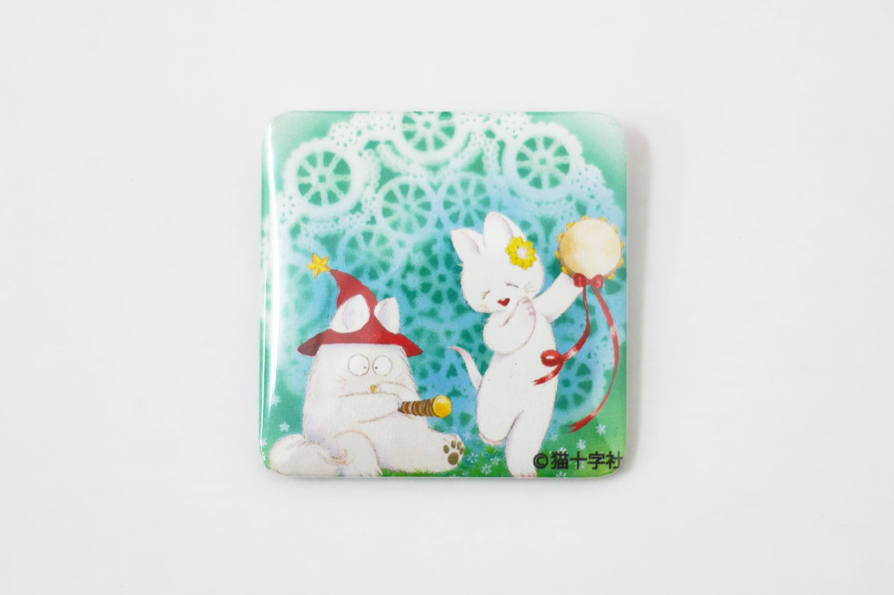 ©猫十字社の漫画作品「小さなお茶会」デザインのオリジナル缶バッジ。